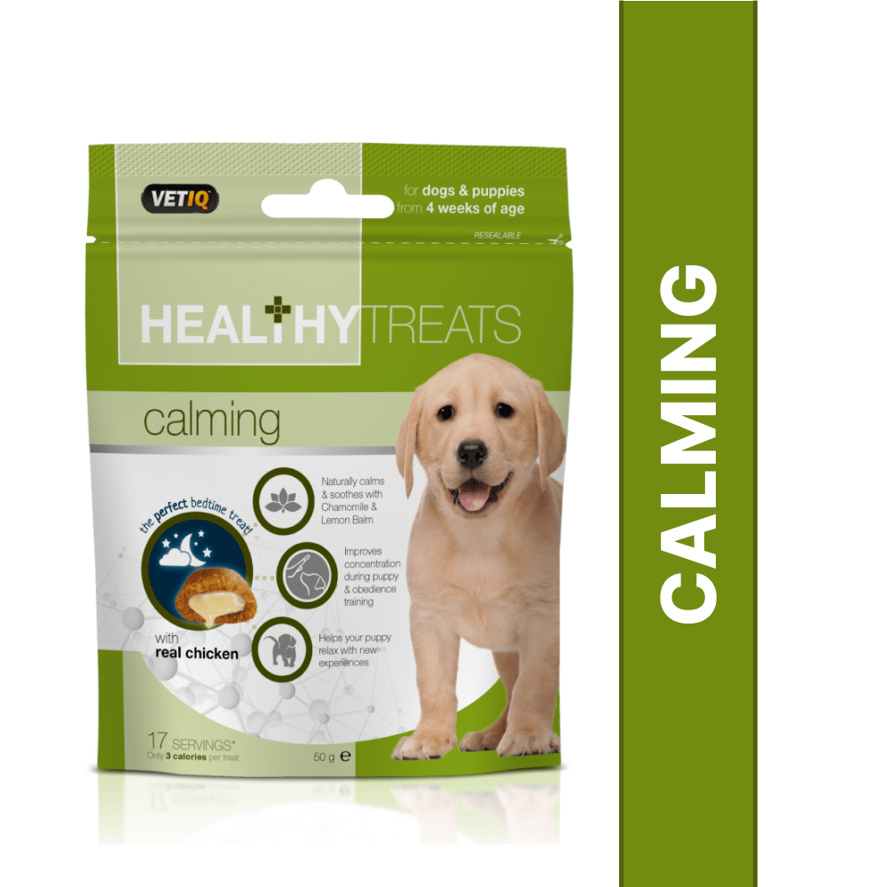 For Dogs and Puppies from 4 weeks of age. Healthy treats calming specially formulated to reduce anxiety during stressful situations such as a new home, training, travel, grooming, staying in kennels, home alone, a trip to the vet, fireworks and loud noises. With real chicken. 17 Servings, Only 3 calories per treat. Key Features Helps reduce anxiety during stressful situations. Naturally calms. soothes with Chamomile & Lemon Balm Help build healthy teeth and bones. Perfect bedtime treat, only 3 cal per treat With real chicken (7%) For puppies from 4 weeks of age. Serving based on an average feeding guide of 4 treats per day 17 Servings 3.6 kcal/ treats Ingredients Wheat Flour, Canola Oil, Corn Starch, Poultry Protein, Flavouring, Glycerine, L-Tryptophan, Sodium Chloride, Ascorbyl Palmitate, Rosemary Extract, Lemon Balm, Vitamin E, Chamomile Oil, Vitamin A, Vitamin D3.