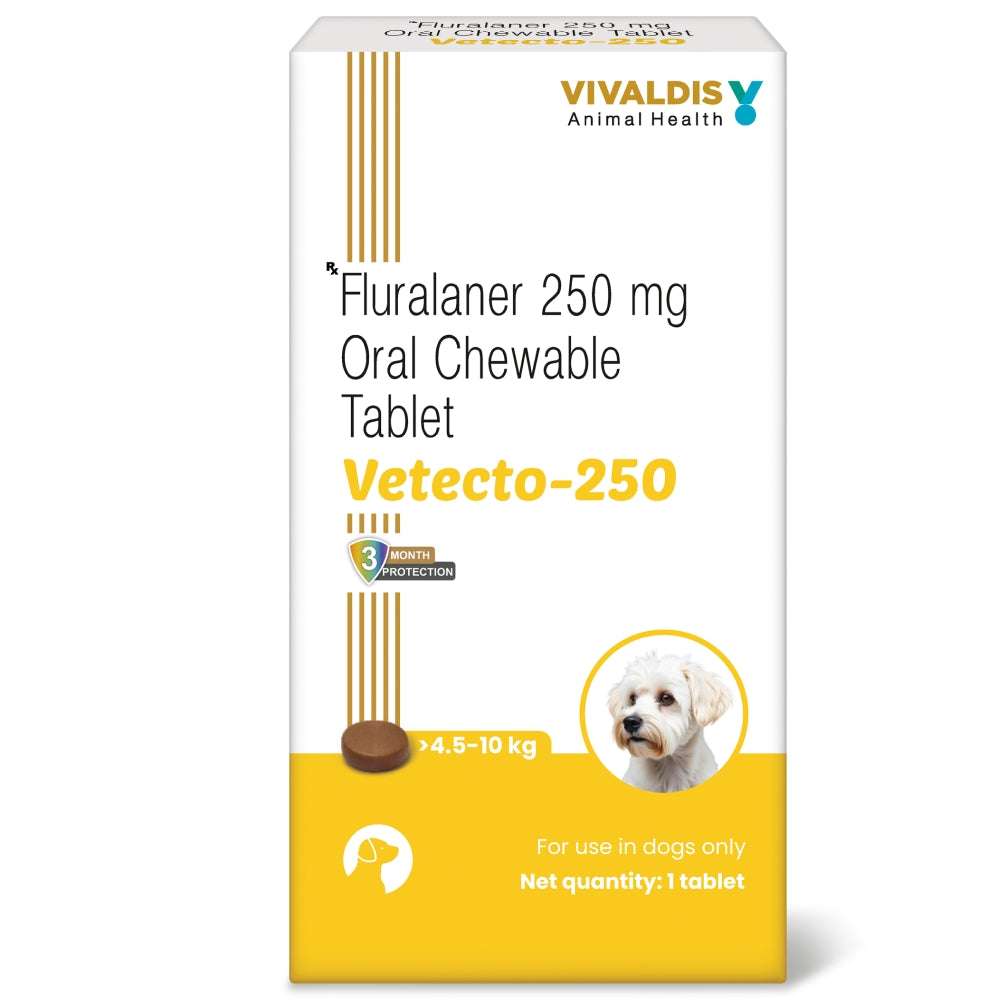 Vetecto 250 is a chewable tablet formulated with Fluralaner 250 mg , designed for small dogs weighing between 4.5 to 10 kg. It provides effective protection against fleas and ticks, ensuring long-lasting defense in a single chew. Manufactured by Vivaldis , this vet-recommended treatment is easy to administer and palatable for dogs. Composition: Fluralaner 250 mg Class: Anti Tick & flea Indications/Uses For prevention and Treatment of fleas & Ticks. Treatment of Demodicosis , sarcoptic mange and Otodectes spp. mite infestation in dogs Directions for use: 0.4 to 0.6 mg/kg BW twice a day for 14 days and then once daily with or without food 1 Chewable tablet in 3 months for > 4.5 to 10 kg BW Dogs 1 Chewable tablet in 3 months for <10- 20 kg BW dogs 1 Chewable tablet in 3 months for <20-40 kg BW dogs 1 Chewable tablet in 3 months for <40-56 kg BW dogs Suitable for Dogs Disclosure: A licensed vendor partner will deliver this medicine to you. Once the pharmacy accepts your order, the details of the pharmacy will be shared with you. Acceptance of your order is based on the validity of your doctor's prescription and the availability of the medicine. Disclaimer: Supertails' sole intention is to ensure that its consumers get information that is expert-reviewed, accurate, and trustworthy. However, the information contained herein should NOT be used as a substitute for the advice of a qualified physician. The information provided here is for informational purposes only. This may not cover everything about particular health conditions, lab tests, medicines, all possible side effects, drug interactions, warnings, alerts, etc. Please consult your doctor and discuss all your queries related to any disease or medicine. We intend to support, not replace, the doctor-patient relationship.